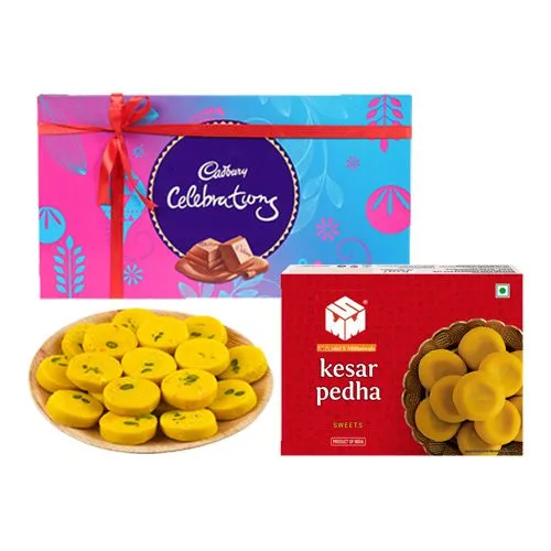 Deliver Kesar Mewa Peda - 250 gm from Mohanlals Mithaiwala with Cadbury Celebration (118g) to surprise on special occasion. (Only Available at Ahmedabad)