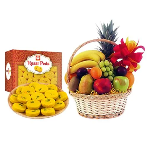 Buy Online to Send Kesar Mewa Peda - 250 gm from Mohanlals Mithaiwala with 2kg Fresh Fruit Basket for your known N loved people. (Only Available at Ahmedabad)