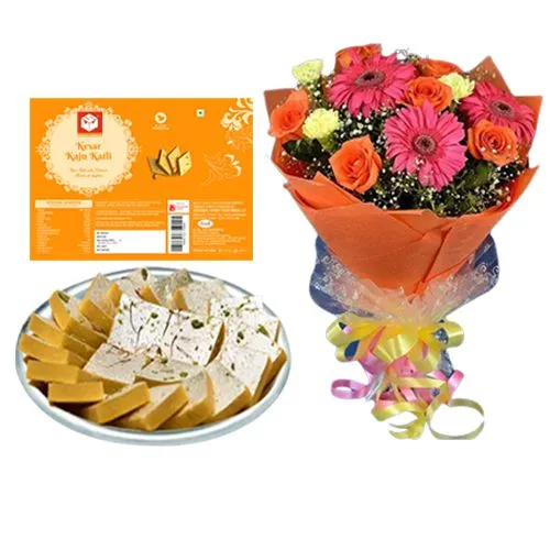Kesar Kaju Katli from Mohanlals Mithaiwala with Seasonal Flower Bouquet