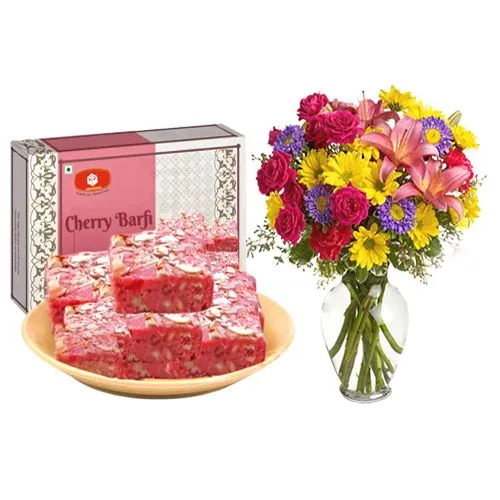 Cherry Barfi from Mohanlals Mithaiwala with Mixed Flower Arrangement