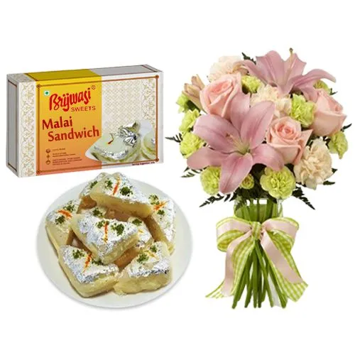 Shop 4 Pc Malai Sandwich from Brijwasi Sweets with a 8 Flowers Bouquet (Pink Lily, White Carnations N Pink Roses) to wish your loved ones on their special days. (Only Available at Mumbai)