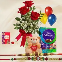 This gift includes: • A Kundan Bhaiya Bhabhi Rakhi Set by Rakhi Sutra (RBBS9524) • Rasgulla (500g) • Cashew (100g) • Complimentary Roli Tika N Chawal • Complimentary Message Card with Free Rakhi