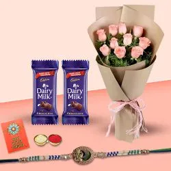 Surprise your brother with a thoughtful Raksha Bandhan combo that blends tradition and indulgence. This gift includes a stunning Floral Kundan Rakhi that captures the essence of elegance and festivity. Alongside, it comes with a pack of 8 delectable Ferrero Rocher chocolates (100g) that add a sweet touch to the celebration. The set also includes complimentary Roli Tika and Chawal for the ritual and a free message card to personalize your wishes, making this gift a complete celebration in itself.