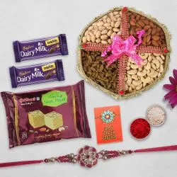 This gift hamper includes: • Set of 3 Kundan Rakhi • Mewa Delight Cashew (100g) • Mewa Delight Walnut (100g) • Bournville Fruit Nut Dark Chocolate Bar (80g) • Complimentary Roli Tika N Chawal • Complimentary Message Card with Free Rakhi