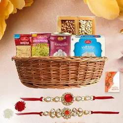 Make Raksha Bandhan truly special with this delightful Rakhi and chocolate combo that embodies love, tradition, and indulgence. The set includes one intricately designed Swastik Rakhi and one beautifully crafted OM Rakhi, both symbolizing prosperity and divine protection. Paired with a premium 8-piece Ferrero Rocher chocolate box, this gift brings the joy of celebration to a new level. The traditional Roli, Tika, and Chawal are provided complimentary, allowing you to perform the rituals with grace. A complimentary message card is included to convey your warm wishes and emotions. With free Rakhi delivery, this combo is an ideal way to send your love across the miles and make the day unforgettable for your brother.