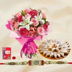 Celebrate the beautiful bond of Raksha Bandhan with our Trio Kundan Rakhi N Nutty Treats Hamper. This elegant gift includes three stunning Kundan Rakhis by Rakhi Sutra (SET3-01) that symbolize love and protection. Complementing the rakhis is a variety of Mewa Delight nuts — cashews, almonds, raisins, and pistachios (100g each) — wrapped in love and care. These premium nuts come arranged in a charming, reusable basket, perfect for adding a touch of luxury to the festivities. Also included in the hamper are complimentary roli tika n chawal and a message card, ensuring that all traditional rituals are joyfully observed. This curated hamper is an ideal fusion of tradition and taste, perfect for making Raksha Bandhan celebrations memorable and heartfelt.