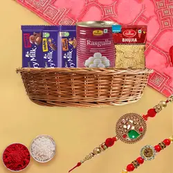 This gift hamper includes: • Set of 3 Kundan Rakhi by Rakhi Sutra (SET3-01) • Mewa Delight Cashew (100g) • Mewa Delight Almond (100g) • Mewa Delight Raisin (100g) • Mewa Delight Pistachio (100g) • A Resueable Basket • Complimentary Roli Tika N Chawal • Complimentary Message Card with Free Rakhi