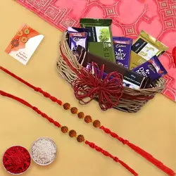 This delightful Rakhi gift set from Rakhi Sutra features five stunning Kundan Rakhis (PRRK8260, PRRK8112A, KPRK0313, PRRK8234Y, PRRK8089Y), each intricately designed to symbolize your deep bond with your brother. To complement the traditional charm, the set includes five pieces of Kitkat coated wafers (18.5g each), offering a perfect blend of sweetness and crunch. Enhancing the ritualistic aspect of the festival, complimentary Roli Tika and Chawal are provided, ensuring a complete and auspicious celebration. Additionally, the set comes with a free message card, allowing you to convey your warm wishes and love. This thoughtfully curated package is ideal for making Raksha Bandhan special and memorable.
