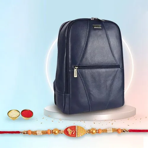 This gift combo contains: • An AD Kundan Rakhi by Rakhi Sutra (ADERKD1203) • Leather Laptop Backpack (Blue, Fits up to 14 Inch Laptop) • Complimentary Roli Tika N Chawal • Complimentary Message Card with Free Rakhi
