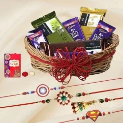 Celebrate the joyous occasion of Raksha Bandhan with our exquisite Kundan Rakhi Delight with Nuts N Chocolate. Designed to honor the cherished bond between siblings, this sophisticated gift hamper features a Set of 3 elegant Kundan Rakhis by Rakhi Sutra (SET3-07), reflecting timeless beauty and intricate craftsmanship. To add a delicious twist, we’ve included 100g each of Mewa Delight Cashews and Walnuts, offering a nutritious and delightful munch. Sweeten the day further with a Bournville Fruit Nut Dark Chocolate Bar (80g), a delectable retreat for chocolate lovers. The hamper also comes with complimentary roli tika n chawal for the traditional ritual and a message card to express your heartfelt wishes. Topping it all off, enjoy a complimentary Rakhi to make the day truly special. This fitting blend of tradition, taste, and elegance makes for a perfect Raksha Bandhan gift that will be remembered fondly.