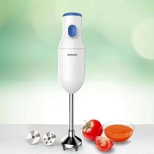 Enter into the heart of someone you admire by gifting this Sensational Philips Hand Blender that wonderfully paves a way for you. This product has the following features: Details: 1. Product Content: Hand Blender 2. Brand: Philips 3. Power Consumed: 250 W 4. Power Supply: 230 V 5. Color: White 6. Blade Material: Alloy Steel 7. Retractable Cord Length: 1.2 m 8. Warranty: 18 Months 9. Country of Origin: India.