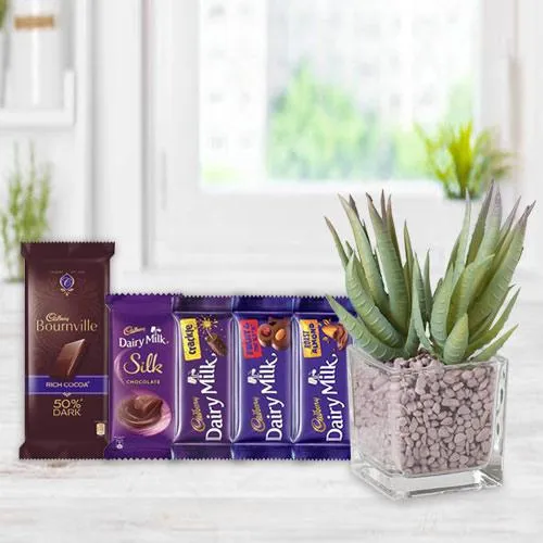 Send surprises as this gift of Exquisite Aloe Vera Plant with Chocolate Delight Combo to the persons close to your hearts. This ethical Gift Hamper holds long lasting Aloe Vera Plant in a designer Glass Pot along with delicious treat of 5 pcs Cadbury Chocolates like Crackle, Fruit n Nut, Bournville, Roast Almond, Silk. Plant Type - Indoor - Medical/Rejuvenating Plant Plant Size - 3 to 7 inch Pot Size - 3 to 4 inch