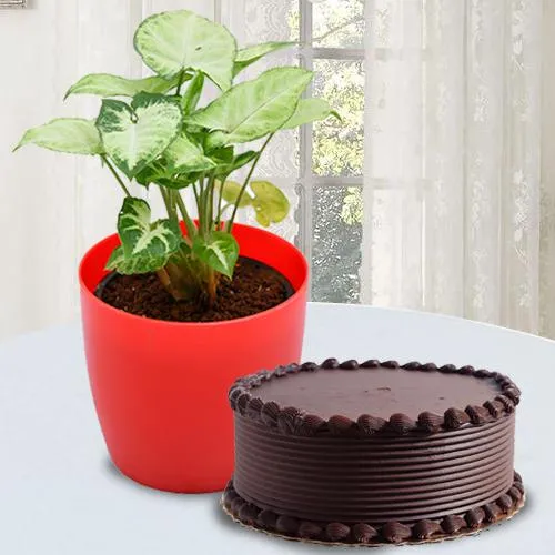 Make your dear one happy by sending this Good Luck Indoor Plant with Chocolate Cake with your special feelings. This ever-growing Syngonium Plant presented in a Plastic Tub comes with 1/2 Kg Chocolate flavor Cake. Plant Type - Indoor - Air Purifying Plant Size - 3 to 7 inch Pot Size - 3 to 4 inch