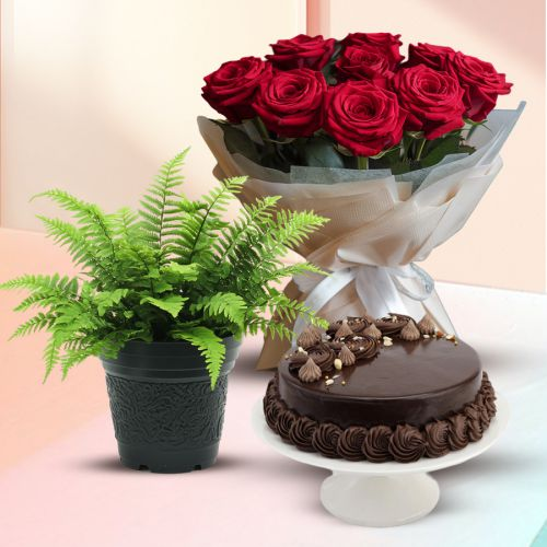Gift your dear ones with Good Luck Indoor Plant with Cake N Red Rose Bouquet so that they feel very special. This festive special hamper is arranged with Bostern Fern Plant in Plastic Pot with 1/2 Kg Chocolate Cake and 10 Red Roses Bouquet. Plant Type - Indoor - Air Purifying & Medical Benefit Plant Size - 3 to 7 inch Pot Size - 3 to 4 inch