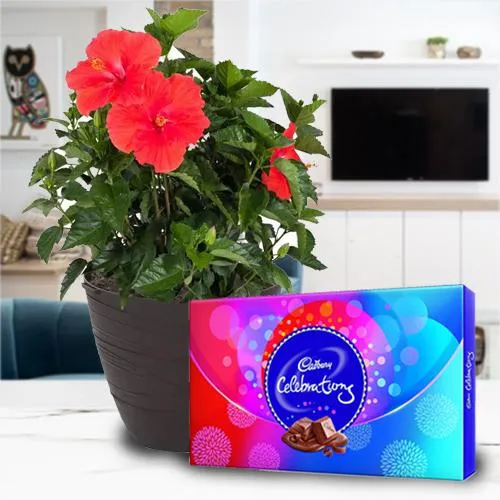 Bring joyful moments into the lives of your dearest ones with this Indoor Present of Tropical Hibiscus Plant in Plastic Pot with Assorted Cadbury Celebration Chocolate Pack (126 gm.) and let them cherish it for lifetime. Plant Type - Indoor - Flowering Plant Plant Size - 3 to 7 inch Pot Size - 3 to 4 inch