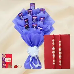 Celebrate the joy of Raksha Bandhan with this rich and indulgent chocolate gift set thats perfect for making your brother feel extra special. This delightful combo features a handpicked assortment of Cadbury chocolates including Dairy Milk Silk (60 gm), Silk Fruit N Nut (55 gm), Silk Roast Almond (55 gm), Dairy Milk Crackle (36 gm), Fruit N Nut (36 gm), Roast Almond (38 gm), and four Dairy Milk bars (13 gm each). Alongside these sweet treats is a beautifully crafted Designer Rakhi that reflects your love and care. Completing the festive ritual are complimentary Roli, Tika, and Chawal, along with a card to pen down your heartfelt Rakhi wishes.