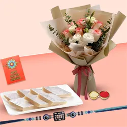 This Rakhi gift hamper has: • Three Rudraksha Rakhi • Haldiram Gulab Jamun 1 Kg • Complimentary Roli Tika and Chawal • A Free Message Card