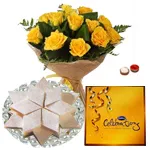 Create magical moments by ordering online this Exclusive Pooja Thali with Kaju Katli N Dry Fruits for your loved ones and spread your warm feelings into their hearts. This festive gift comes with Silver Plated Pooja Thali (Size: 5-6 inch) with 250 gms Kaju Katli and 400 gms Dry Fruits (Almond, Cashew, Pistachio and Raisin 100 gms each).