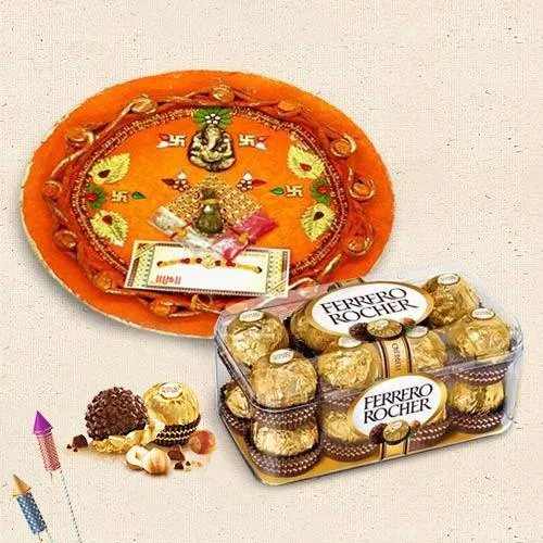 Create a beautiful world for your loved ones by sending this Exquisite Combo of Ferrero Rocher N Pooja Thali wrapped up in the essence of your love and warm feelings. This Combo consists of 16 pcs. Ferrero Rocher with Designer Pooja Thali (size: 6-7 inches).