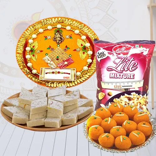 Amaze your loved ones by gifting them this Amazing Goodies Combo and make them crave for more. This Combo comes with 250 gm Boondi Ladoo, 250 gm Kaju Katli, Designer Pooja Thali (size:6-7 inches) and 250 gm Haldirams Mixture.