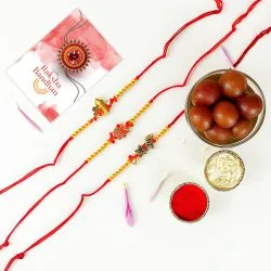 Celebrate your sibling’s love with this charming Bhaiya Bhabhi Rakhi set, beautifully adorned with pearls. The package also includes roli chawal and a lovely Rakhi wishes card to share your sentiments.