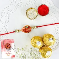Express your love with this vibrant collection of Meenakari Stone Rakhis. Accompanied by Roli Chawal and a personalized Rakhi Wishes Card, this set ensures your sentiments shine through.