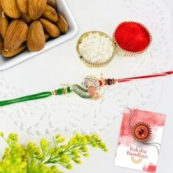 This gift consists of: • Kaju Katli (200g) • Cashew (100g) • 2 Krishna Rakhi • Complimentary Roli Chawal • Complimentary Rakhi Wishes Card with your Message