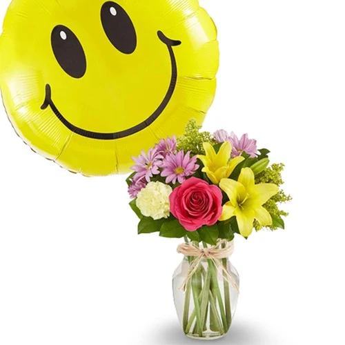 Order this Blooming Flowers With Smile and make your dear ones happy. This arrangement has: a) Hot Pink Roses b) Yellow Asiatic Lilies c) Yellow Carnations d) Lavender Daisy Poms e) Accented With Assorted Greenery f) Clear Glass Vase (8 inch) g) Gift Wrapping h) A Greeting Card