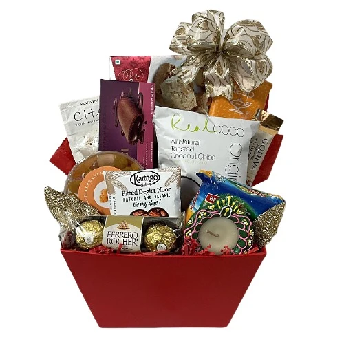 Impress your dear ones by sending this Delish Diwali Delights Basket and elegantly brighten up their mood instantly. This gift hamper has: a) Aloo Paratha Mix b) Authentic Wooden Roller c) Indian Napkin d) Dal Biji Snack mix e) Poppadums f) Mutter Paneer mix g) Garam Masala h) Lime Relish i) Masala Tea j) 2 pc Mango Drinks k) Gulab Jamun Tin (2.2 lb) l) Wicker Basket with floral picks m) Gift Wrapping n) A Greeting Card