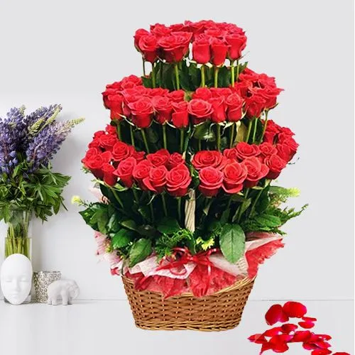 Be the most romantic person in your loved ones eye on Valentines Day by sending this Charming 100 Red Roses Layer Arrangement on a cane basket and gain appreciation for your choice.