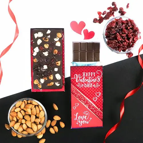 This Valentine gift hamper includes: • 100 Grams Chocolate Bar (Roasted DryFruits Filling N Cranberry Filling) • Wrapped in Valentines Theme Digital Print on Bar Box Top