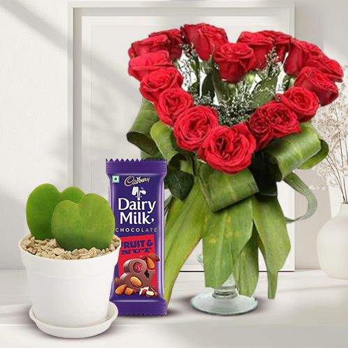 Render happiness to your loved ones on Valentines Day by ordering online, this Delightful Combo of Heart Shape 18 Red Roses Arrangement in a Glass Vase, Cadbury Dairy Milk Fruit n Nuts Chocolate Bar (36g) n Hoya Heart Love Plant that they will cherish through their entire lifetime.