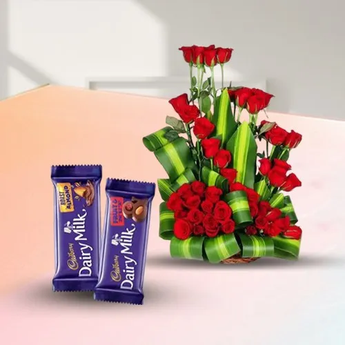 Order online for your beloved on Valentines Day, this Alluring Arrangement of 50 Red Roses in a Cane Basket coupled with a Cadbury Dairy Milk Silk Fruit and Nut Chocolate Bar (36g) and a Cadbury Dairy Milk Silk Roasted Almonds Chocolate Bar (36g) that will clearly convey how much you love him/her.