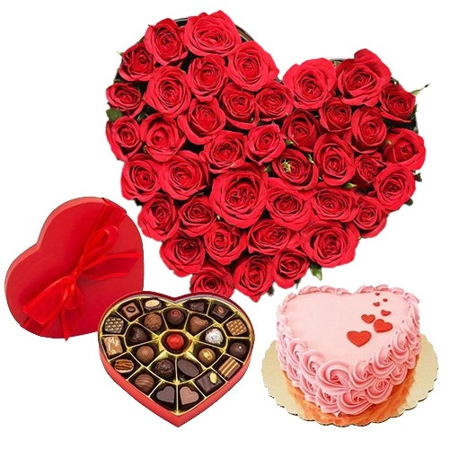 24 Red Roses in Heart Shaped Basket With Heart Shaped Cake 1 Lb and a Heart Shaped Chocolate Box