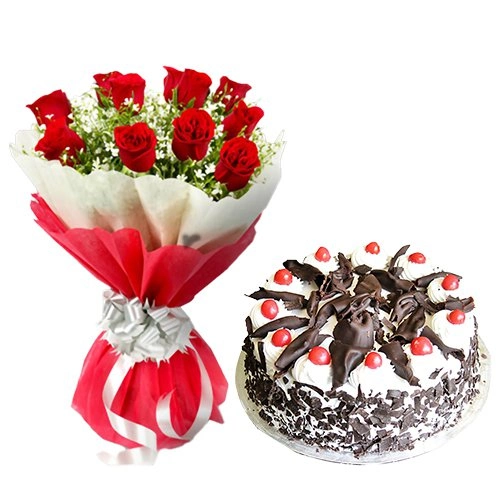 12 Exclusive Dutch Red Roses with Black Forest cake 1 Kg from 5 star Hotel Bakery