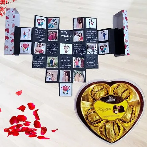 An unique gift for your loved ones on Valentines Day, this Appealing Pop Out Heart Personalized Card with Heart Shape Sapphire Chocolates. This valentine gift combo has Pop Out Heart Personalized Photo Card with 5 pcs Heart Shape Sapphire Hazelfills Chocolate Box will uplift the mood of your loved ones.
